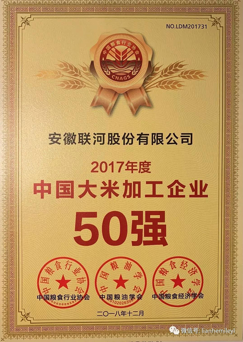 安徽聯河股份有限公司再次獲得中國大米加工企業“50強”稱號。