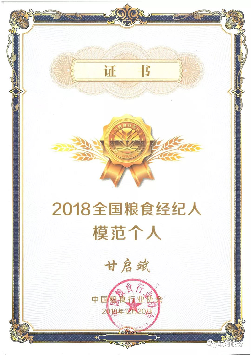 會議同期對全國糧食經紀人模范集體和模范個人進行了表彰。經專家評審,決定授予安徽聯河集團董事長甘啟斌“2018全國糧食經紀人模范個人”稱號。
