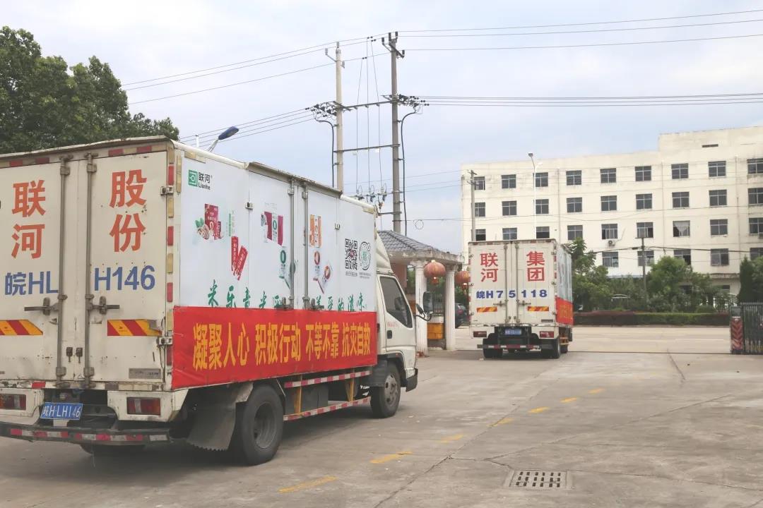 7月12日下午,安徽聯河集團兩部車身貼著紅色橫幅“齊心協力 防汛搶險”“攜手并肩 保衛家園”的貨車,緩緩開進望江縣華陽鎮、雷池鄉支援防汛抗災的武警官兵臨時駐地,車上滿載著為一線防汛官兵捐贈的生活物資,以實際行動為防汛抗災貢獻聯河力量。