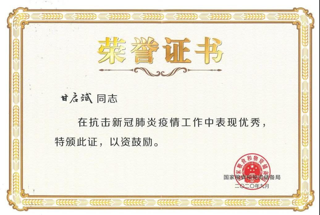 繼公司董事長甘啟斌2020年9月被評為“全國糧食和物資儲備系統抗擊新冠肺炎疫情先進個人”后,公司再次榮獲“抗擊新冠肺炎疫情先進民營企業”榮譽稱號。