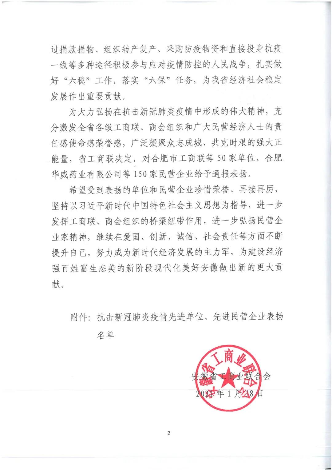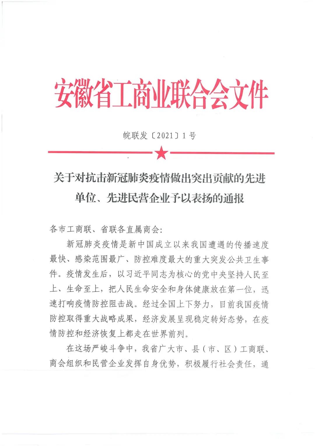 會上,發布了《關于對抗擊新冠肺炎疫情做出突出貢獻的先進單位、先進民營企業予以表揚的通報》,對安徽省50家單位和150 家民營企業給予通報表揚。公司榮獲“抗擊新冠肺炎疫情先進民營企業”通報表彰。